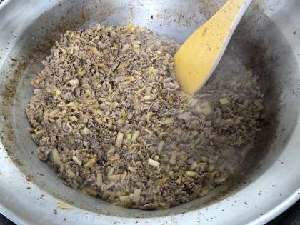 写真は、本日の給食の見本と、豚肉のコチジャンいための調理の様子です。