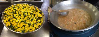 写真は上から「今日の献立・牛ひじきそぼろの調理光景とさごしが焼きあがった光景・カットしたかぼちゃとみそ汁の配缶光景」です!
