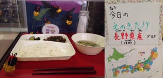 ワンタンの皮のスープは具だくさんのスープで、使用されるえのきたけは長野県産のものでした。また、ワンタンの皮の個別対応献立でした。