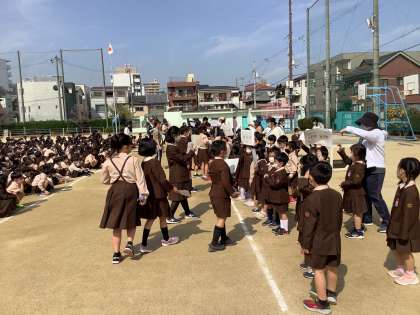 4月11日は入学お祝い集会がありました。児童会代表の6年生がしっかりと挨拶をしてくれたあと、1年生からは「よろしくお願いします。」とかわいい声がかえってきました。明日から集団登校がスタートします。