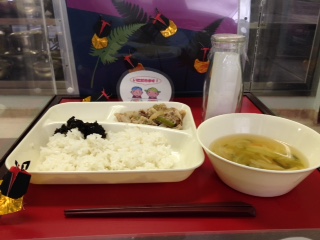 本日の献立は「豚肉のごまみそ焼き・すまし汁・のりのつくだ煮・ごはん・牛乳」でした。