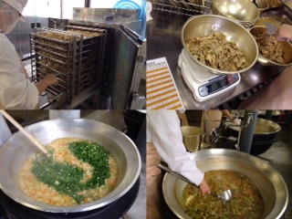 「豚肉のごまみそ焼きとすまし汁の調理風景」