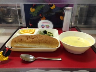 オレンジは一人1/4個でカリフォルニア産のオレンジが使われ、むきやすいように切れ込みをいれました。
