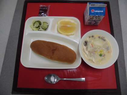 5月10日(火)の献立は「コッペパン(いちごジャム)・牛乳・コーンクリームシチュー・キャベツときゅうりのサラダ・かわちばんかん」でした。