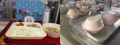 ・今日の献立とクラスごとに並べられた個別対応献立用のお椀