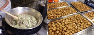 左は豚肉と野菜を釜でいためている写真です。