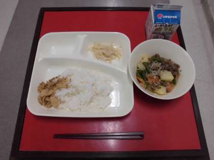 5月16日(金)の献立は「ごはん・牛乳・肉じゃが・もやしのゆずの香あえ・ごまかかいため」でした。