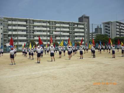 みんなでフラッグを振ると、バシッとよい音が鳴ります。曲のテンポに合わせてフラッグを振ったり、移動したりしています。フラッグの振り付けを覚えるのは大変ですが、運動会でよい演技ができるように一生懸命練習に取り組んでいます。