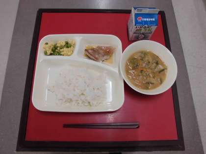 5月25日(水)の献立は「ごはん・牛乳・あかうおのしょうゆだれかけ・みそ汁・えんどうの卵とじ<個別対応献立>」でした。