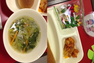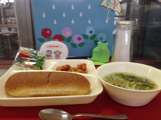 本日の献立は「えびのチリソース・中華スープ・豆こんぶ・パン・牛乳」でした。