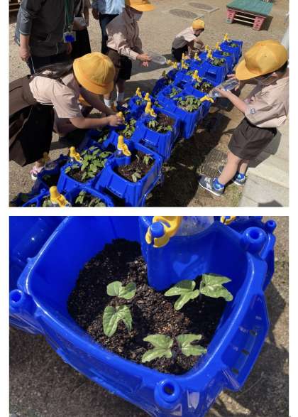 あさがおの種をまいてから、毎日水やりをしています。中には「おおきくなあれ〜!」と言いながら水をあげている人もいます。芽が出るたびにうれしくって、いくつ芽が出ているのか教えてくれます。