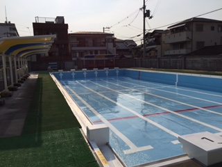 6月16日(月)いよいよ明日からプール水泳が始まります。今日は教職員でプール開き前の準備をしました。お家でも水着等の用意をお願いします。
