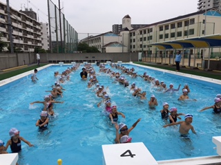 最初なので、安全にプール水泳学習を進めるためのやくそくを一つずつ確認していきました。いざ水に入った子どもたちは「楽しかったけど、ちょっと水が冷たかったです。」と言っていました。明日以降、他の学年も順次プールに入ります。体調を整えて元気に参加できるようにしましょう。