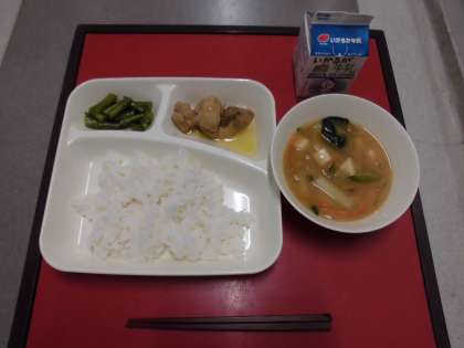6月9日(木)の献立は「ごはん・牛乳・鶏肉のしょうゆバター焼き・とうふのみそ汁・さんどまめのごまあえ」でした。