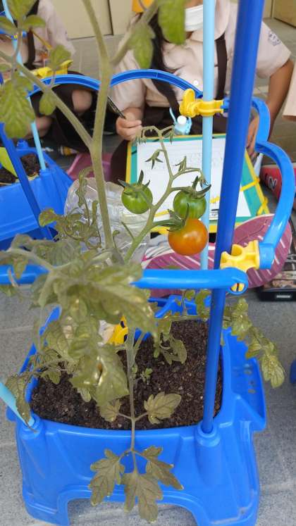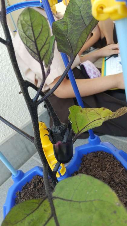 2年生の生活科で、野菜を育てています。毎日水やりを頑張っています。もうすぐ収穫できそうです。