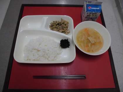 6月14日(火)の献立は「ごはん・牛乳・豚肉のごまみそ焼き・すまし汁・のりのつくだ煮」でした。