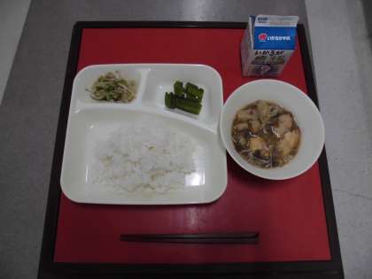6月16日(木)の献立は「ごはん・牛乳・すき焼き煮・オクラのかつお梅風味・もやしとピーマンのごまいため」でした。