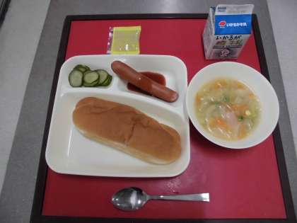 6月22日(水)の献立は「コッペパン・牛乳・ウインナーのケチャップソース・スープ・きゅうりのサラダ アプリコットジャム」でした。