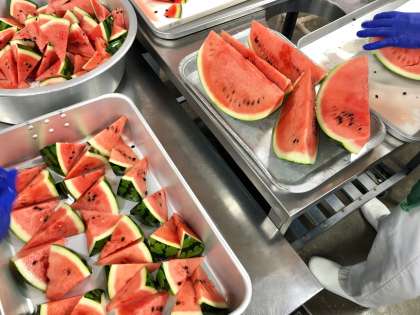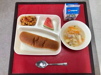 7月6日(水)の献立は「黒糖パン・牛乳・パエリア・ウインナーとキャベツのスープ・すいか」でした。