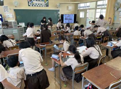 国語の学習では、「防災ポスター」をグループで作成しています。