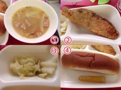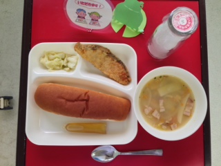 本日の献立は「サーモンフライ・コーンスープ・キャベツのソテー・パン・牛乳」でした。