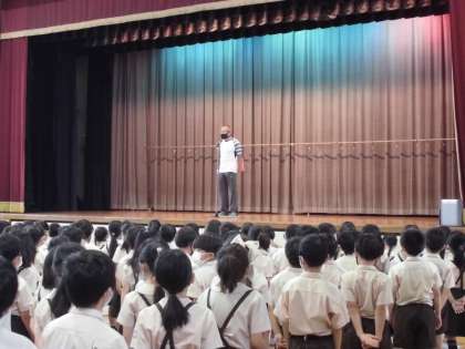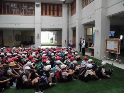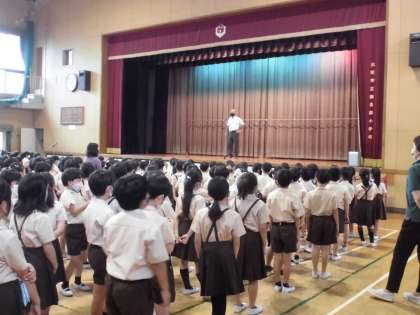 今週の学校生活も始まりました。校長先生からは、折り鶴集会での真剣な取り組みを褒めていただきました。また、Jボードなどの遊び方について、安全に注意して遊ぶよう、お話がありました。4年生は浄水場への社会見学です。注意事項をきちんと聞いている様子でした。