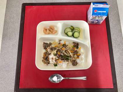 7月11日(月)の献立は「牛丼・牛乳・きゅうりのしょうがづけ・大福豆の煮もの」でした。