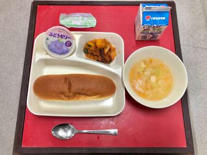 7月13日(水)の献立は、「黒糖パン・牛乳・かぼちゃのミートグラタン・スープ・ぶどうゼリー」でした。