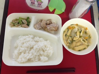 本日の献立は「鶏肉のしょうゆマヨネーズ焼き・みそ汁・野菜いため・ごはん・牛乳」でした。