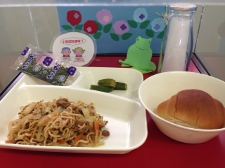 本日の献立は「焼きそば・オクラの中華あえ・パン・牛乳」でした。