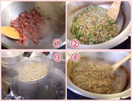 (1) 豚肉を炒めているところです。