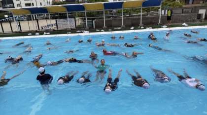 はじめは、服を着たまま水に入ることに慣れていない様子でしたが、ペットボトルを使って背浮きをしたり、背浮きをした状態で平泳ぎをしたりして、少しずつ着衣でも泳ぐことができるようになっていました。