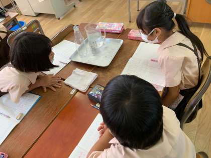 二学期から、算数では水のかさについての学習をしています。色々な容器や色水を使って楽しく取り組んでいます。