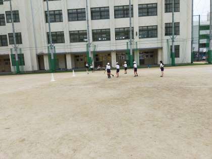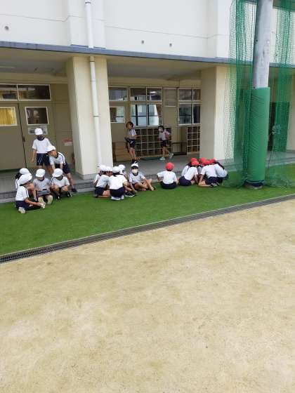 体育で簡易版のキックベースのようなゲームをしています。試合の後、各チームで作戦を練ってよりよくしようと話し合っています。