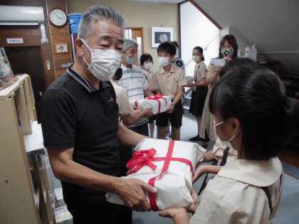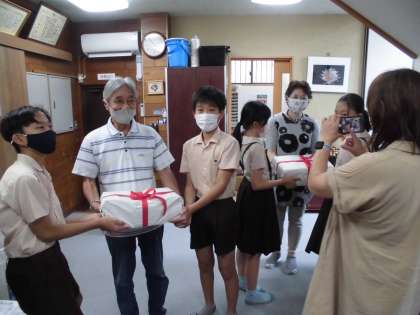 地域にお住まいのお年寄りの方に向けて、全校児童でお手紙を書きました。書いたお手紙は、児童会の6年生が代表して公民館に持っていき、受け取っていただきました。いつも見守っていただき、ありがとうございます。