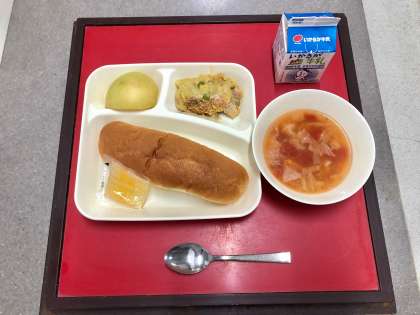 9月14日(水)の献立は「コッぺパン(マーマレード)・牛乳・豆乳マカロニグラタン[米粉]・トマトスープ・なし(二十世紀)」でした。