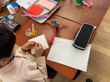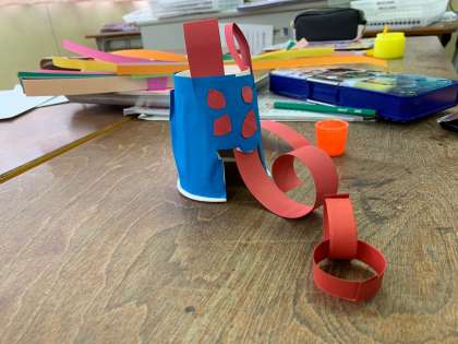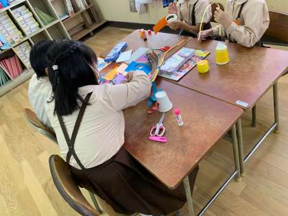 紙コップを使っておばけを作っています。画用紙を折り重ねたり切り貼りしたりして自分たちで想像したおばけを作るのを楽しんでいます。