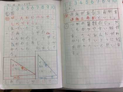 三角形と四角形ついて学習をしました。長方形と正方形を半分に切ってできた三角形を見て直角三角形の特性について考えました。友だちと話し合い沢山気づいたことをノートに書きました。