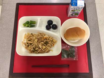 9月28日(水)の献立は、「黒糖パン(小)・牛乳・焼きそば・オクラの甘酢あえ・ぶどう(巨峰)」でした。