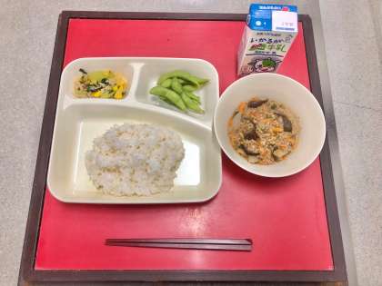 9月29日(木)の献立は、「ごはん・牛乳・マーボーなす・チンゲンサイとコーンのいためもの・えだまめ」でした。