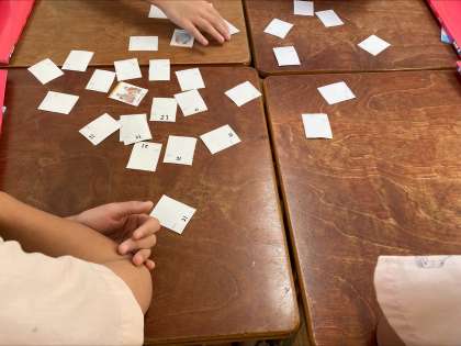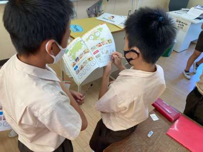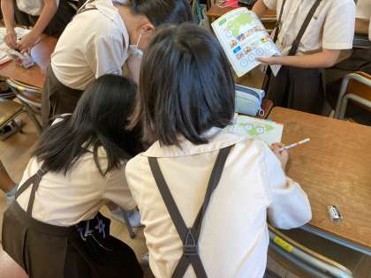 Unit4「What time is it?」で好きな時間について、学習しています。初めに、1日の生活の中でどのような時間があったのか確認しました。その後、自分の好きな時間を伝え、やり取りしていました。5人以上やり取りしている子どもも見られました。