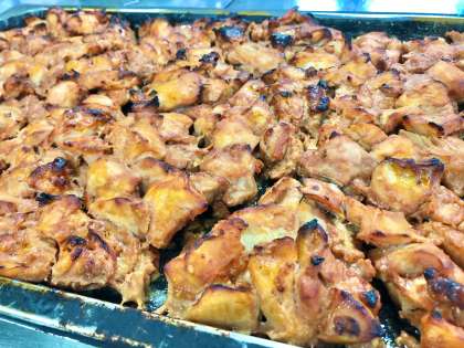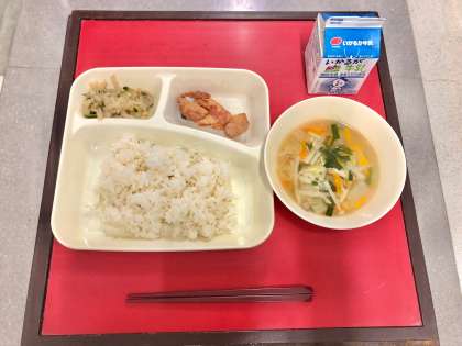 10月3日(月)の献立は「ごはん・牛乳・鶏肉のチリソース焼き・焼き豚とワンタンの皮のスープ・切干しだいこんのごま辛みづけ」でした。