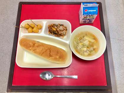 10月5日(水)の献立は「おさつパン・牛乳・なすのミートグラタン・鶏肉と野菜のスープ・さくらんぼ(缶)」でした。