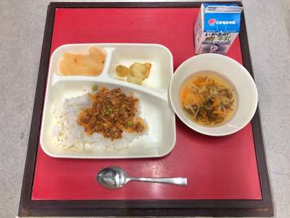 10月6日(木)の献立は「タコライス・牛乳・もずくのスープ・焼きじゃが・和なし(缶)」でした。