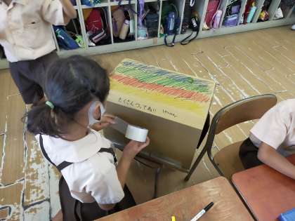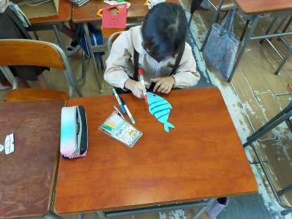 来週のわくわくキッズ広場に向けて準備をしています。3−3では「魚釣り」をするのでかごや魚、釣竿を作りました。他の学年に遊んでもらうのを楽しみにしています。