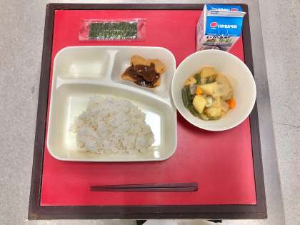 10月11日(火)の献立は「ごはん・牛乳・みそカツ・じゃがいもと野菜の煮もの・焼きのり」でした。