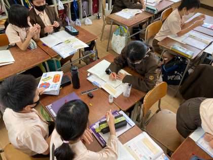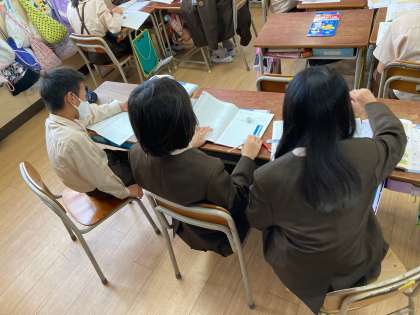 明日のテストに向けて、確かめをしています。3人班になり、わからない問題を教えあう姿が見られ、「ほんまや!」や「なるほど、そういうことか!」という声が聞こえました。自分のノートを用いて、積極的に教えあっていました。