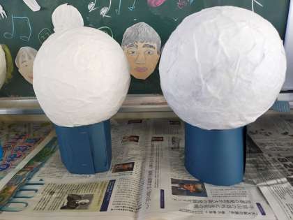 図工の時間に張り子で作りました。乾いたら、オレンジで色を塗っていきます。何を作っているのでしょうか。完成が楽しみです。