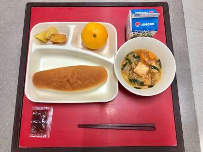 10月20日(木)の献立は「コッペパン(いちごジャム)・牛乳・豚肉といかの中華煮・大学いも・みかん」でした。