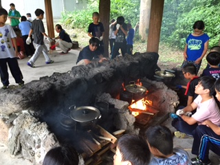 昼前に宿舎に戻って飯盒炊飯でカレーライスを作っているところです。